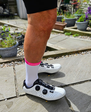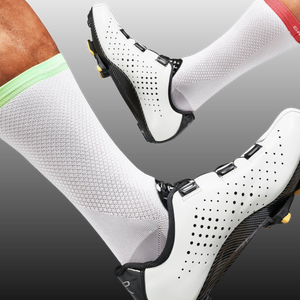 Cycling kit, socks included, comes in all colours of the rainbow, but we acknowledge that there is no better aesthetic than white socks with white shoes and the pro's know it as well. So like the pro's we start with a performance level white sock and add graphics and colour to perfectly compliment any kit combination. When you look good you want to go fast.